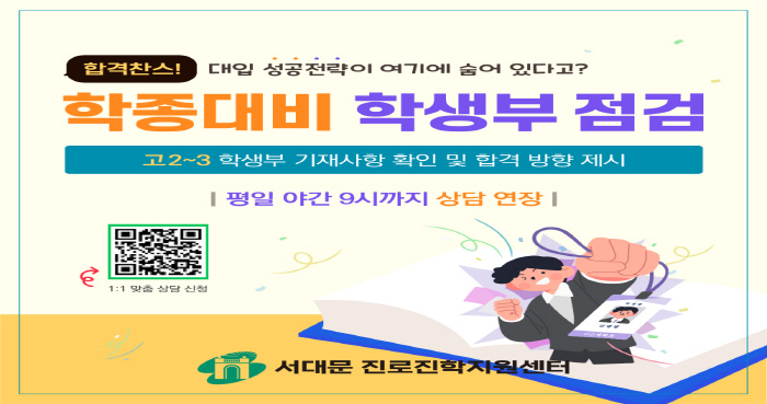 서대문구(구청장 이성헌)는 대입 수시 ‘학생부 종합전형’을 잘 준비할 수 있도록 최근 관내 고등학생 2~3학년생과 학부모를 대상으로 ‘1:1 학생부 점검 컨설팅’을 시작했다고 19일 밝혔다. 구는 고교 학생부에 기재된 학교생활 전반을 살펴보고 학생의 현재 수준과 성장 가능성을 파악해 대입 수시전형에 체계적으로 대비하도록 이를 마련했다. 전문 컨설턴트가 학업성적, 자질, 학습태도, 참여(체험)활동 등을 분석해 강점과 약점, 개선점을 도출하고 최대한의 잠재력이 발휘될 수 있는 ‘학생부 관리 방법 및 방향성’을 제시한다. 상담은 연중 서대문 진로진학지원센터(수색로 43, 4층) 상담실에서 화∼토요일 오전 10시부터 학생들의 하교 시간을 고려해 저녁 9시까지 한 명에 50분씩 이뤄진다. 관내 거주하거나 관내 학..